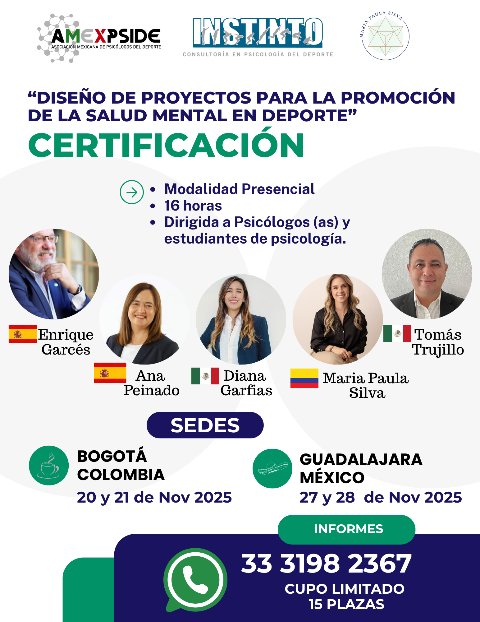 Esta certificación es una alternativa efectiva para estos objetivos, un grupo de expertos reconocidos por su trayectoria profesional en psicología del deporte se han unido para ofrecer esta capacitación de 16 horas a Psicólogos que busquen diseñar proyectos preventivos de indicadores de salud mental en contextos del deporte.